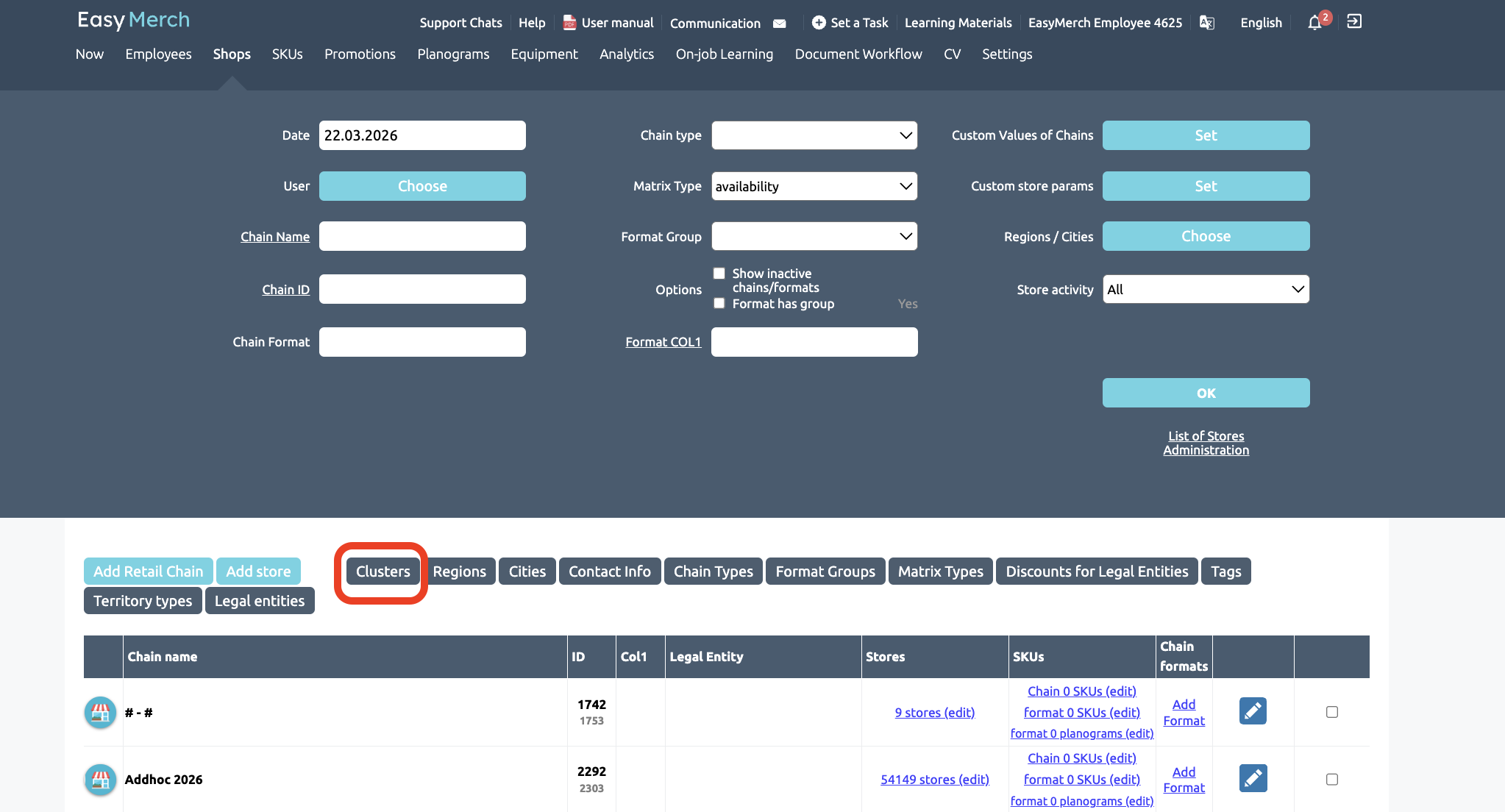 To add employees to clusters, go to the ‘Clusters’ section via the ‘Shops’ section