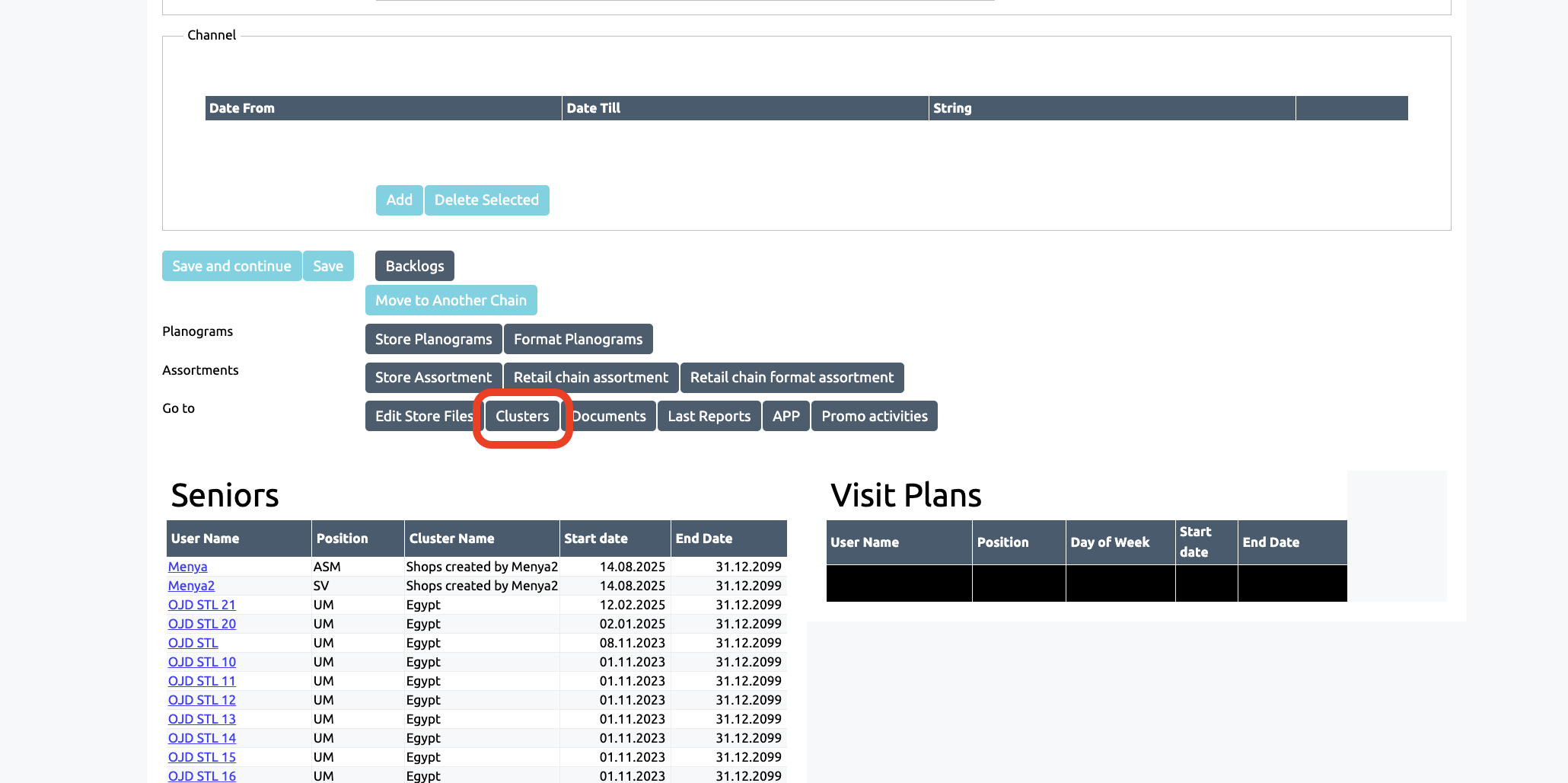 Clusters can be used to manage shops. Clusters allow shops to be assigned to employees independently of their visit schedules, making them responsible for the shops. Stores can be assigned according to predefined rules to one or more employees