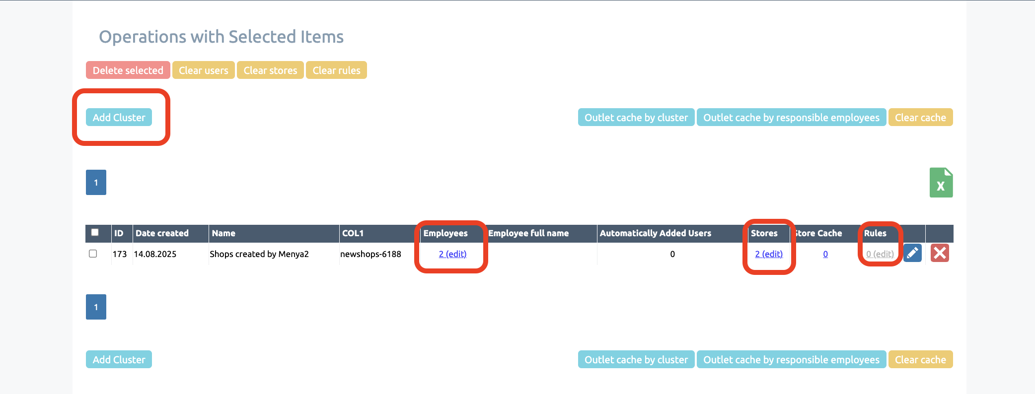 To do this, return to the previous page (the cluster stores section) and click on the pencil icon to edit