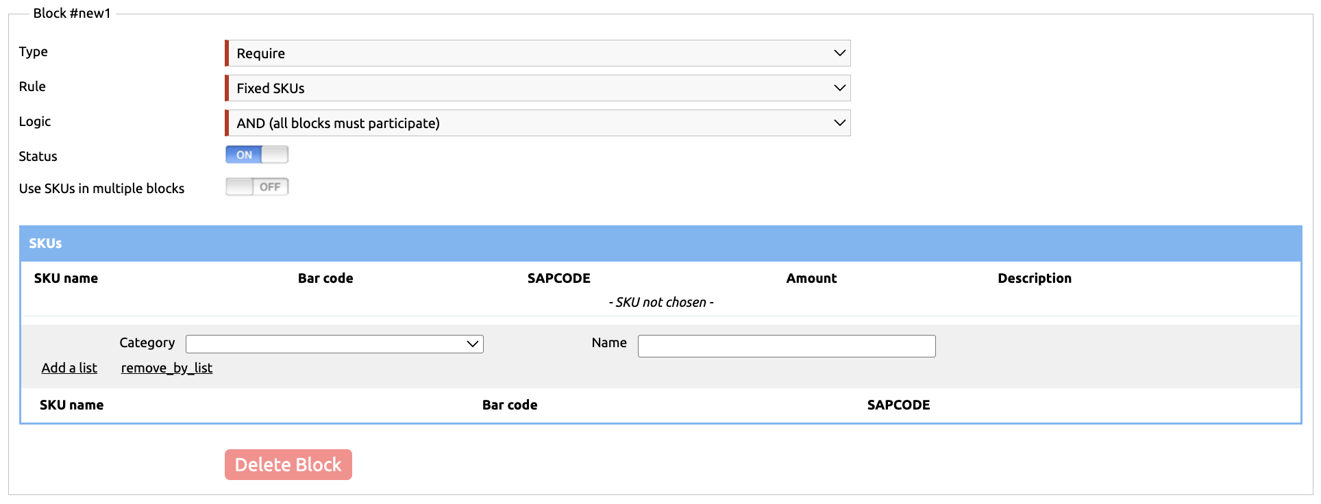 Select "Fixed SKUs" in the Rule field, then in the SKUs table choose the exact products participating in the promotion. You can add them as a list by selecting a category, or individually using search by name