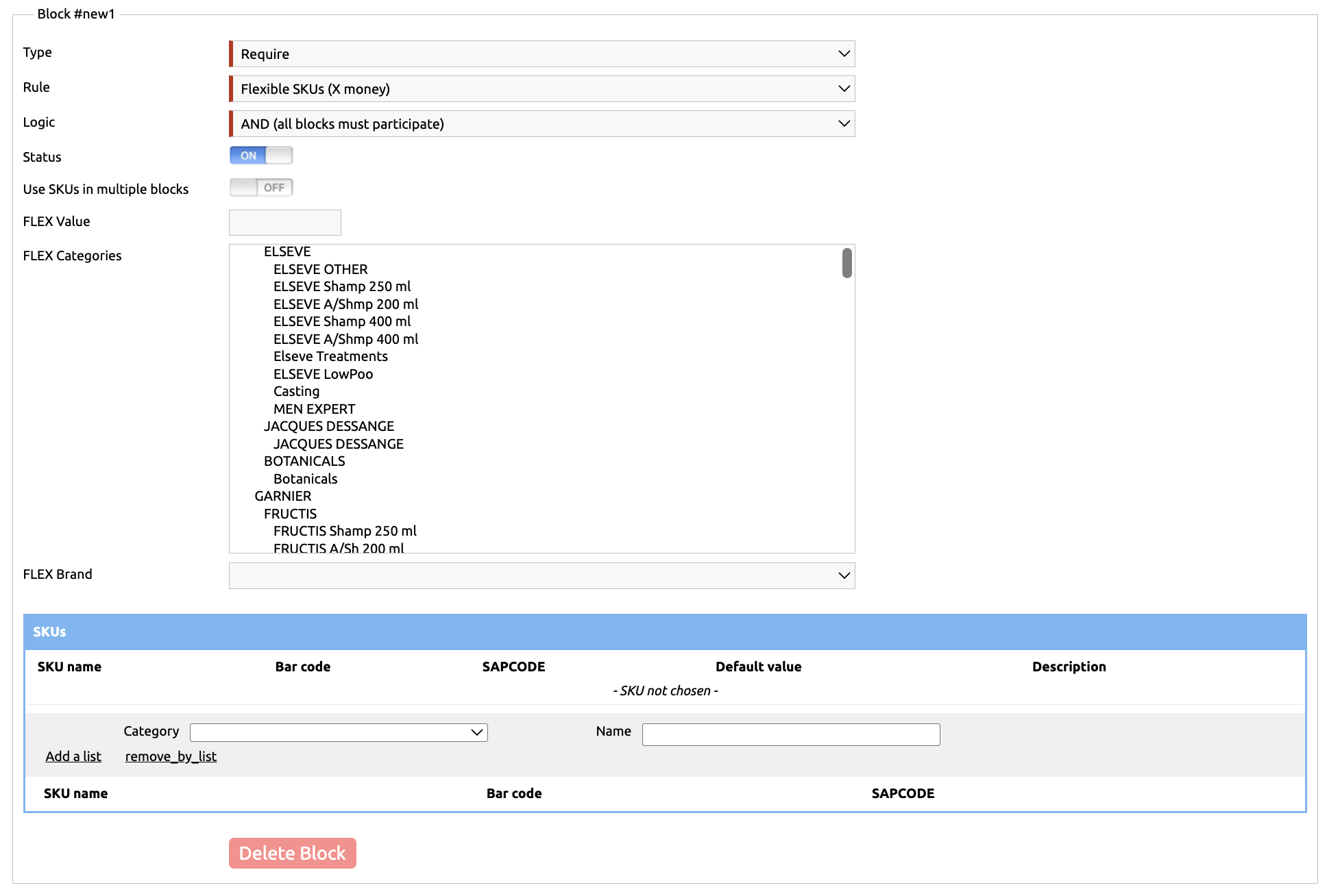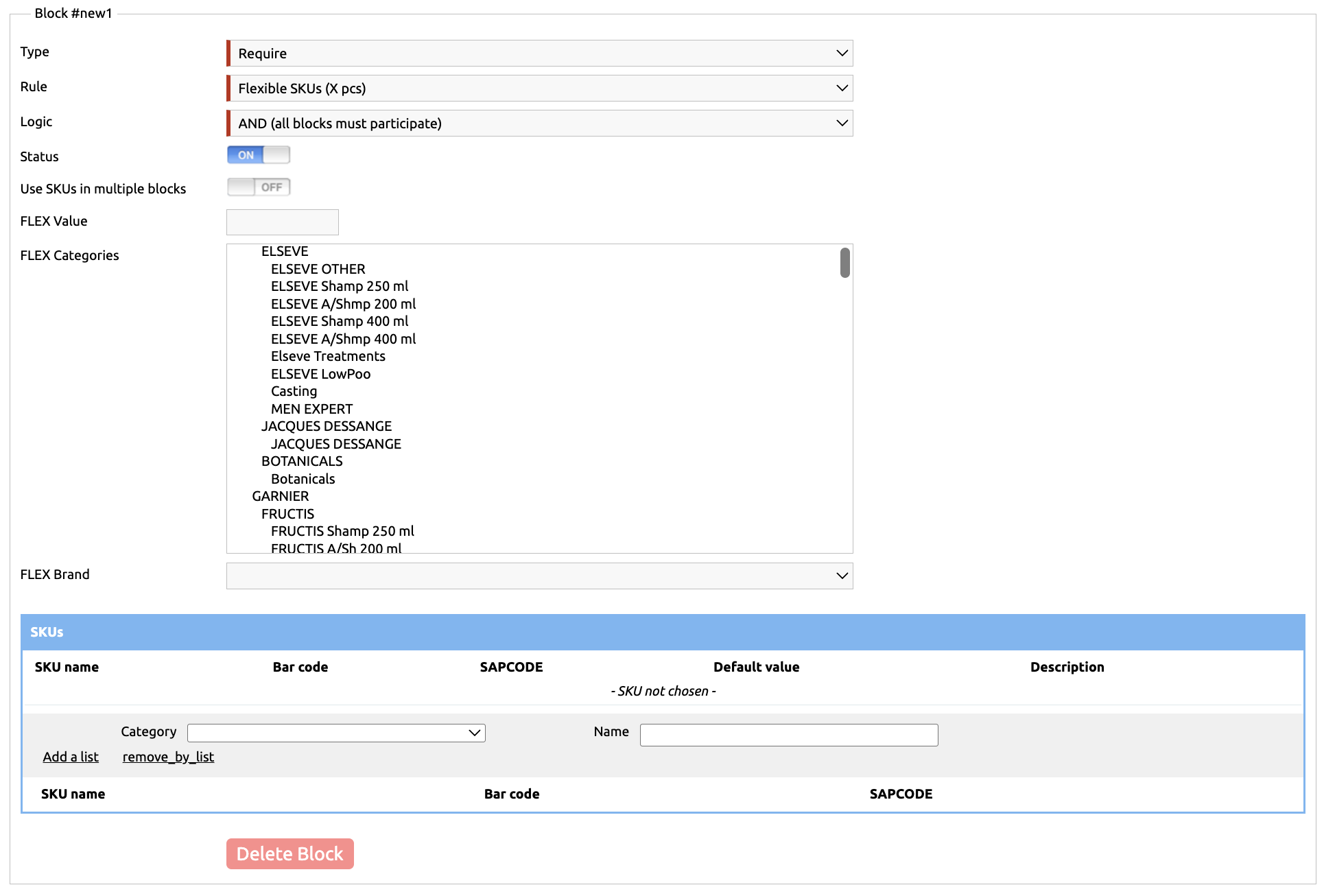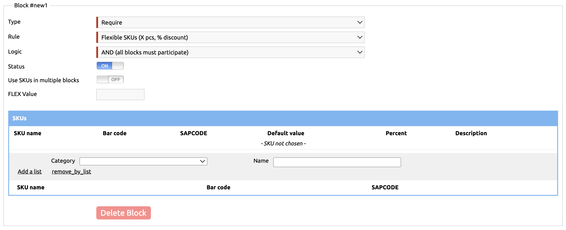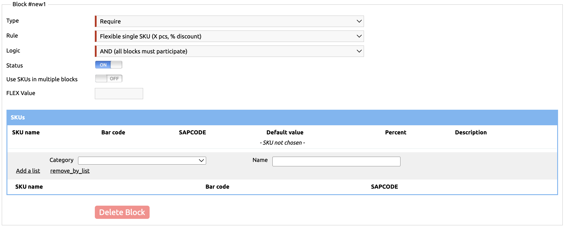 After that, you can either select specific products participating in the promotion in the SKUs table, or specify a FLEX category so you don’t have to select each item individually