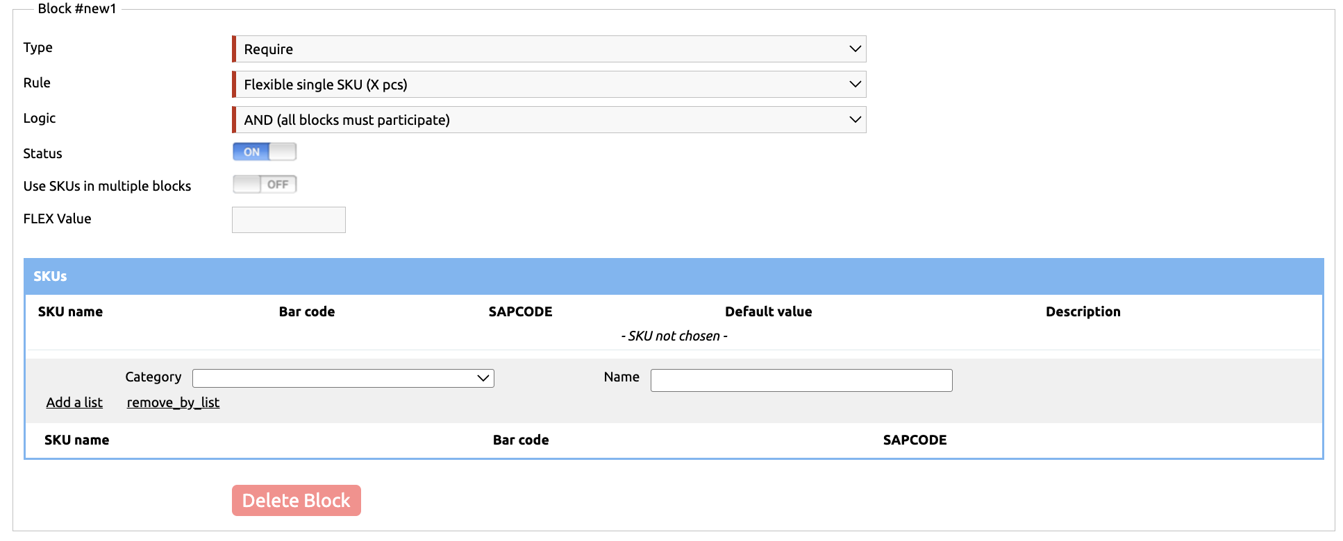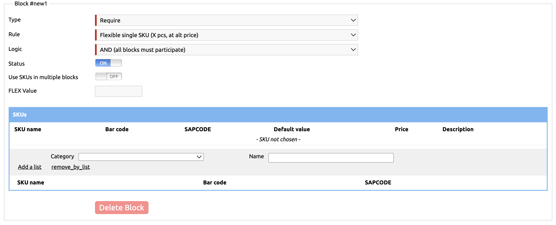 Enter a number in the FLEX Value field, and specify the list of products in the SKUs table. The customer can choose any single product from the list, and if they purchase it in the quantity specified in FLEX Value, the condition is considered fulfilled