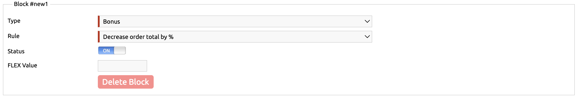 This rule works the same way as “Flexible single SKU (X pcs, at all price)” — meaning the customer must choose one product from the list and purchase it in the specified quantity (the required quantity is set in the FLEX Value field) — but it differs in that it does not require a BONUS block