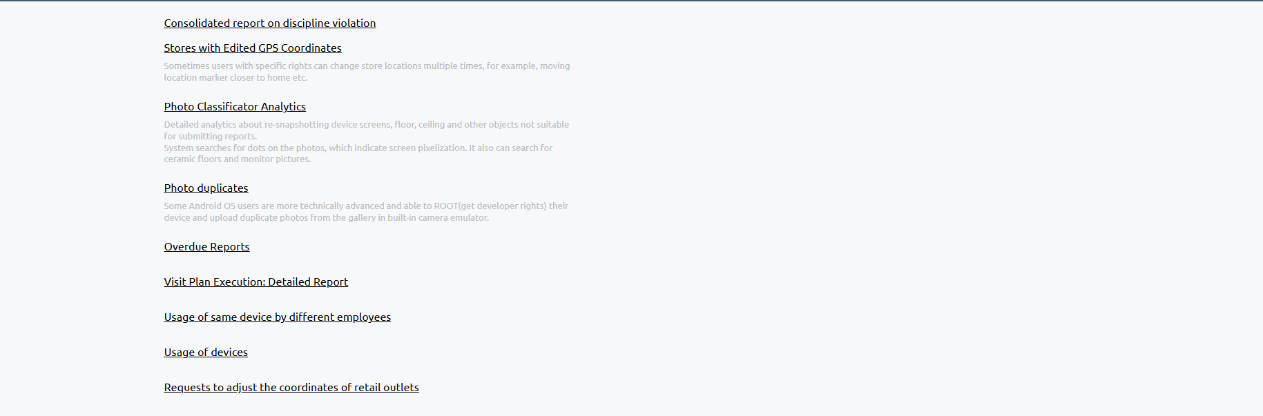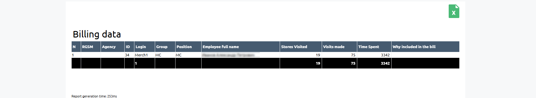 In this section you can get detailed information about visits made by employees, including date, time, types of reports completed, comments, location accuracy, etc.