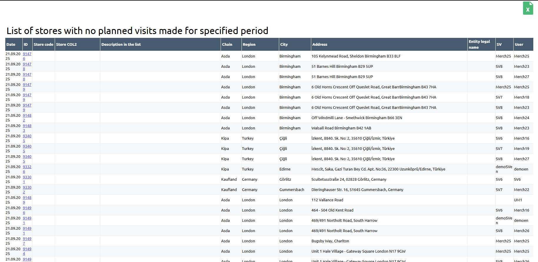 To get the list of shops included in the visit plan, but not visited for the period you selected, open the List of stores with no planned visits made for specified period.