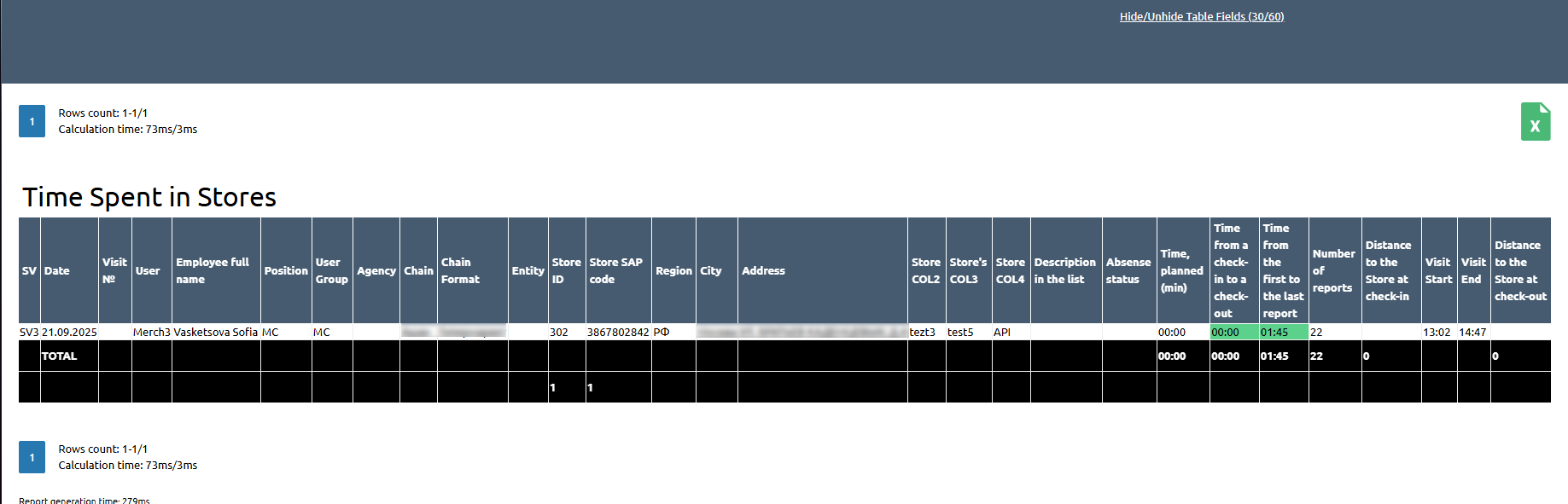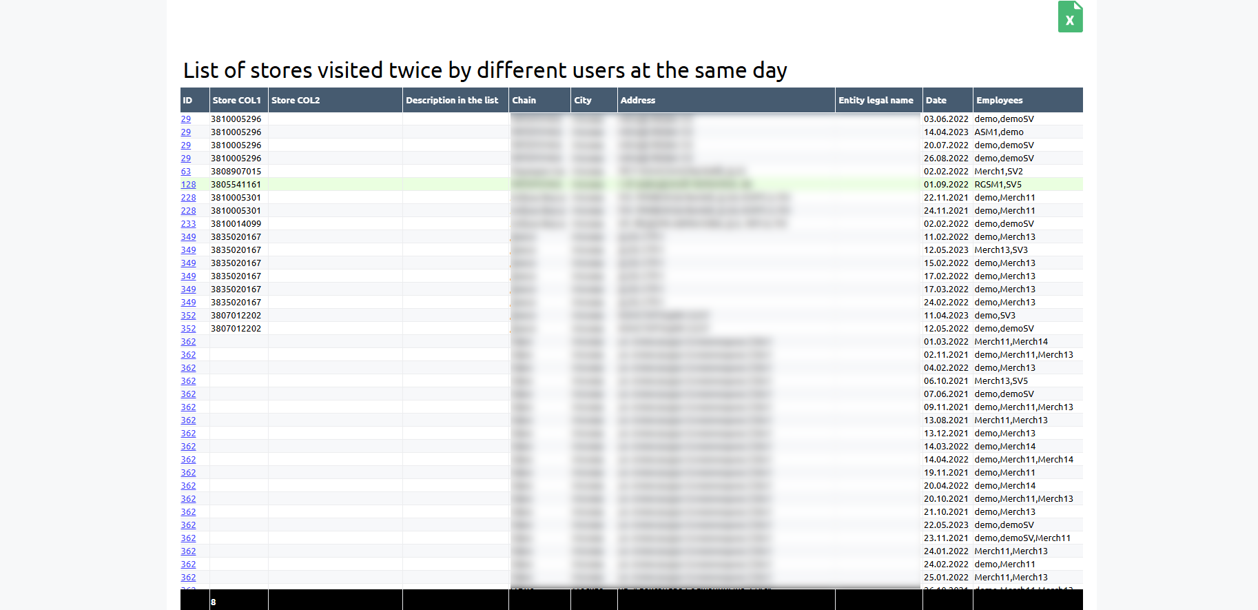 To get the list of shops visited by different employees on the same day, open the List of stores visited twice by different users at the same day.