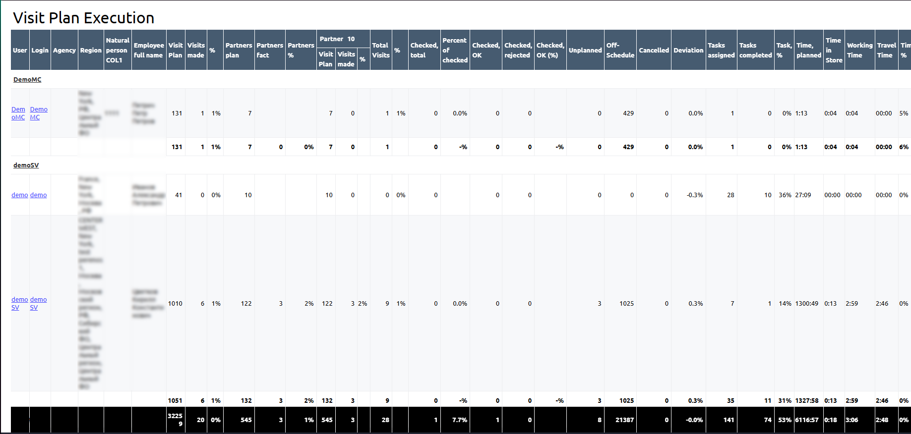 The section allows you to get statistics on visit plan implementation by employees. It can be customized by date, by attendance percentage and by team of employees.