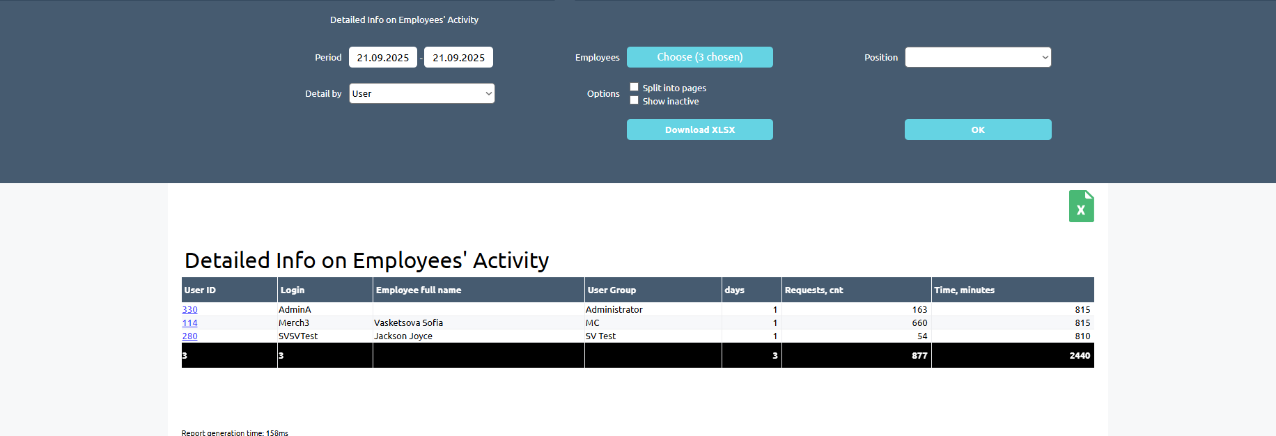This report displays detailed information on each employee accessed to the web interface, including days, time and number of requests.